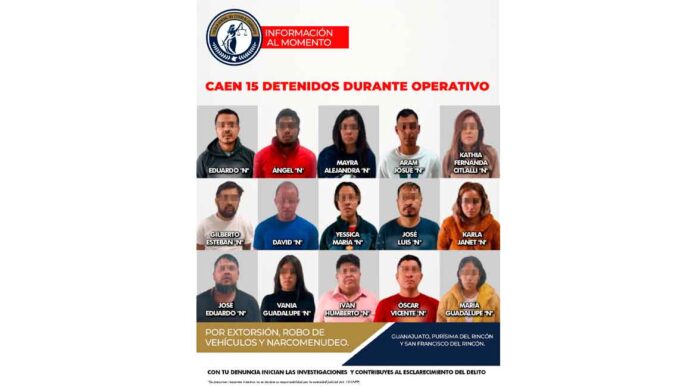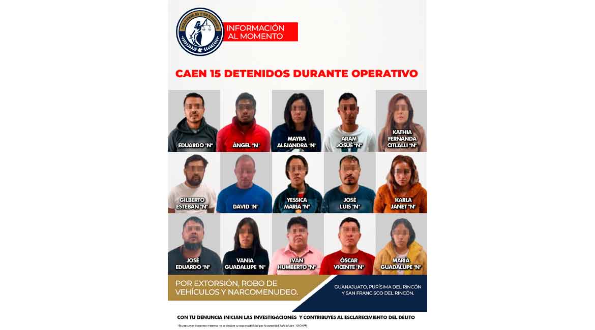 Entre los detenidos se encuentran: EDUARDO «N», ÁNGEL «N», MAYRA ALEJANDRA «N», ARAM JOSUÉ «N», KATHIA FERNANDA CITLALLI «N», GILBERTO ESTEBAN «N», DAVID «N», YESSICA MARÍA «N», JOSÉ LUIS «N», KARLA JANET «N», JOSÉ EDUARDO «N», VANIA GUADALUPE «N», IVÁN HUMBERTO «N», ÓSCAR VICENTE «N» Y MARÍA GUADALUPE «N».