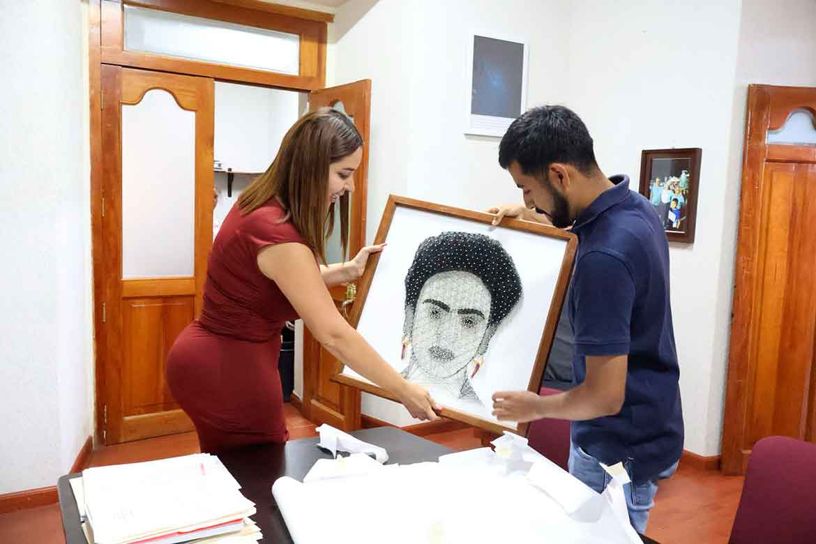El estudiante de 19 años, realiza obras de arte con una técnica llamada hilorama; a partir de la Expo Emprende tuvo un acercamiento con la alcaldesa Yozajamby Molina quien lo felicitó y le solicitó un cuadro de Frida Kahlo