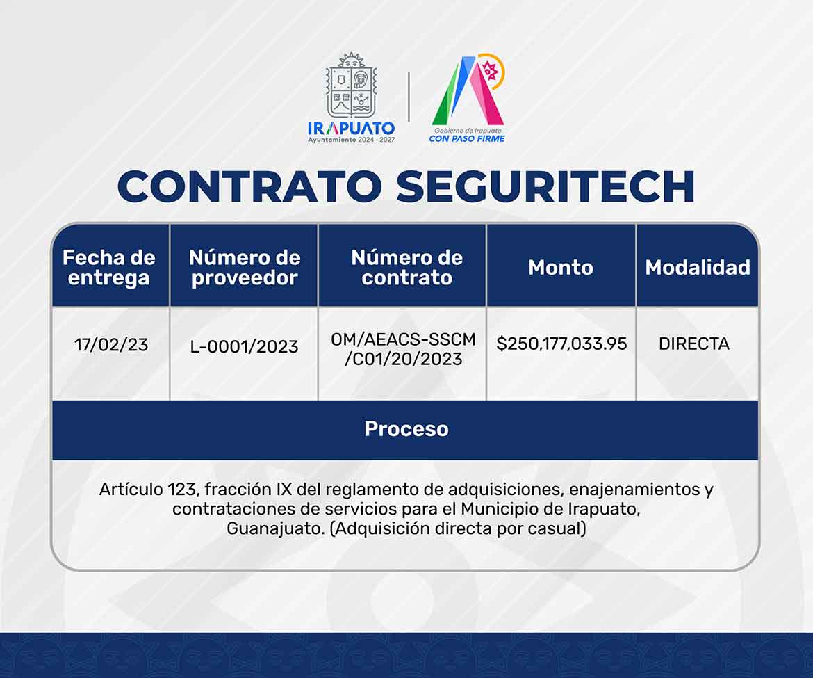 Irapuato, Gto. 31 de julio de 2025.– El Gobierno Municipal de Irapuato informa que ha entregado de manera puntual, formal y completa la información requerida por la Auditoria Superior del Estado de Guanajuato (ASEG), en relación con los contratos entre la Administración Pública Municipal y la empresa Seguritech Privada S.A. de C.V.