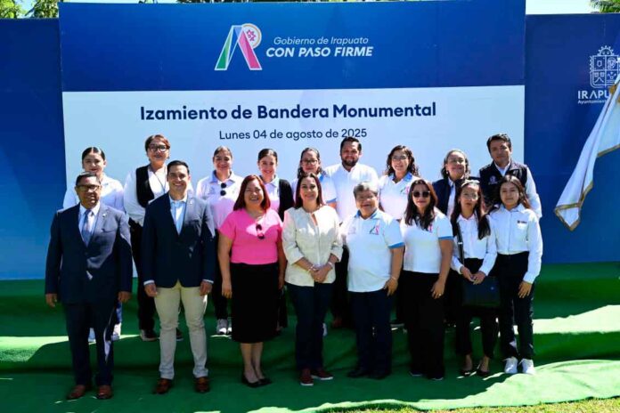 Irapuato, Gto. 04 de agosto de 2025.– Con el objetivo de promover los valores cívicos y conmemorar las efemérides del mes de agosto, autoridades del Gobierno de Irapuato realizaron el izamiento de la bandera monumental en una ceremonia solemne.