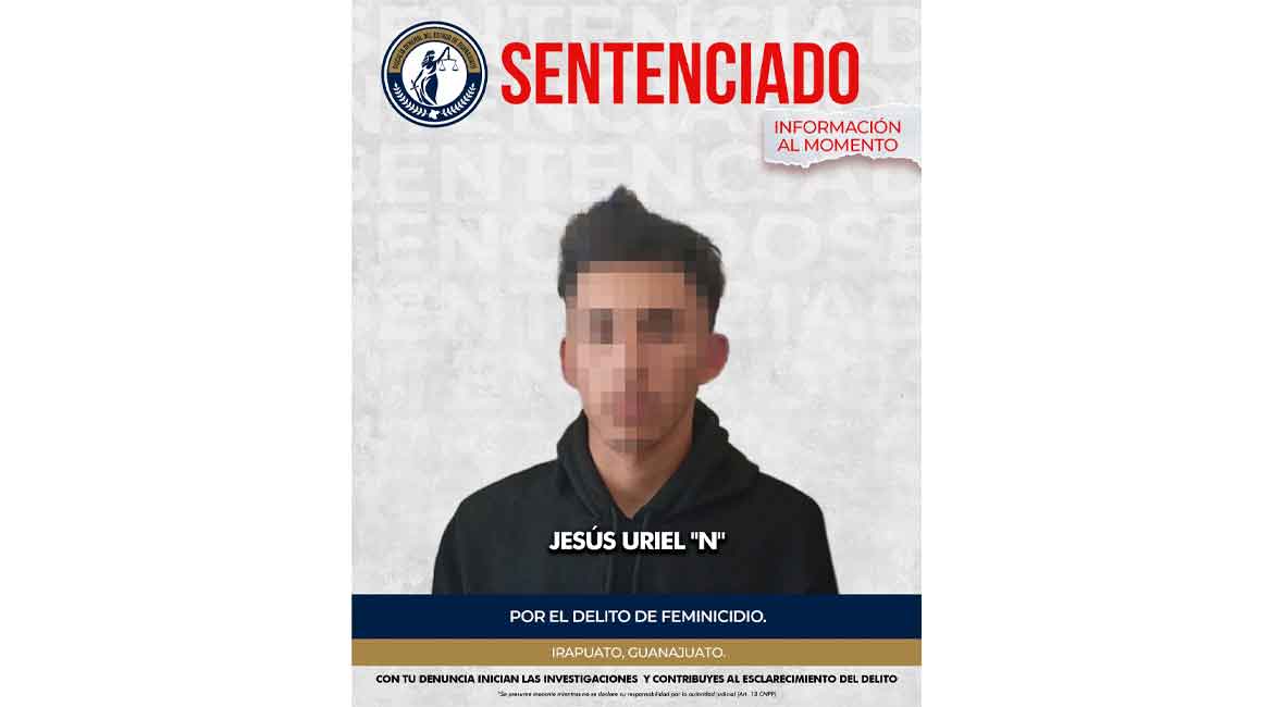 La Fiscalía General del Estado de Guanajuato informa que, como resultado de una investigación integral sustentada en pruebas científicas y jurídicas sólidas, se obtuvo sentencia condenatoria de 25 años de prisión en contra de JESÚS URIEL “N”, responsable del delito de feminicidio.