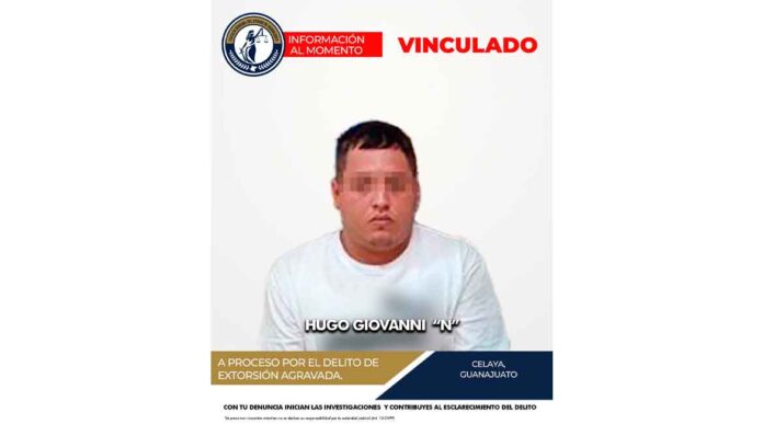 La Fiscalía General del Estado de Guanajuato logró la detención de HUGO GIOVANNI “N”, tras una investigación desarrollada por la Unidad Especializada en Combate a la Extorsión, que permitió acreditar su probable participación en el delito de extorsión agravada, cometido en el municipio de Celaya.