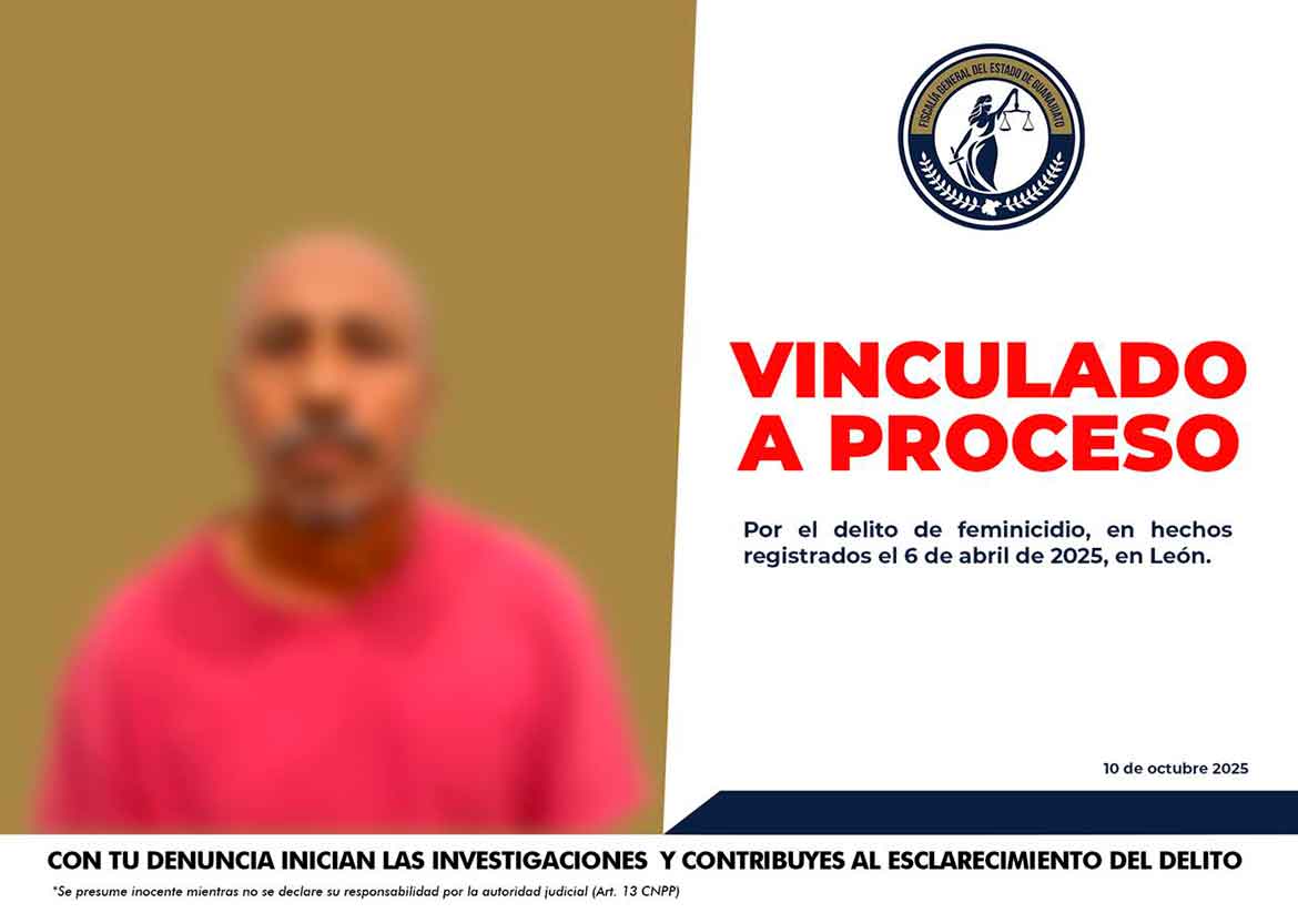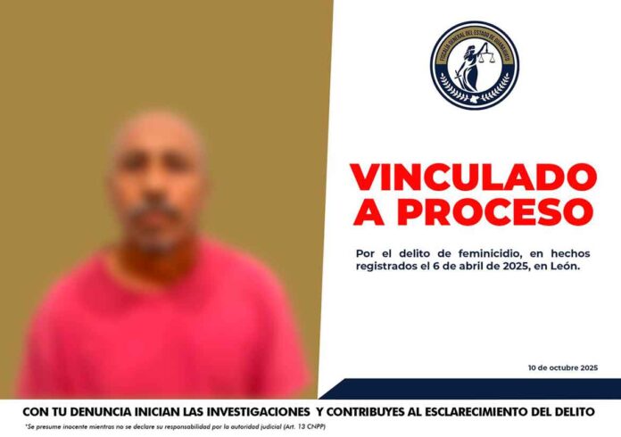 La Fiscalía General del Estado, a través del Ministerio Público, obtuvo la vinculación a proceso penal de JUAN MANUEL REMEDIOS “N”, señalado como probable responsable del delito de feminicidio, ocurrido el pasado 6 de abril de 2025, en la ciudad de León.