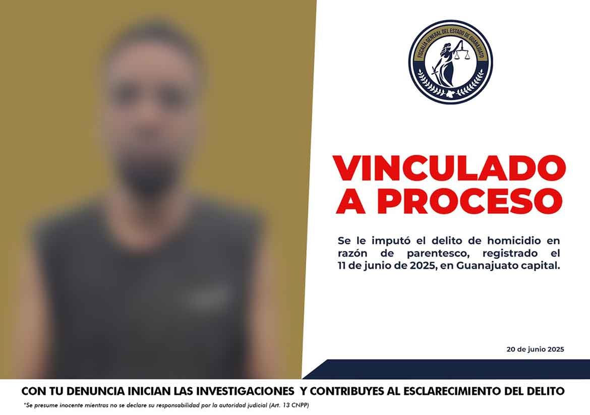 La Fiscalía General del Estado llevó ante un Juez a un sujeto de 30 años por su probable responsabilidad en el asesinato de su padre, ocurrido en el municipio de Guanajuato. Como resultado de la investigación, este sujeto ya se encuentra en prisión por el delito de homicidio en razón de parentesco.