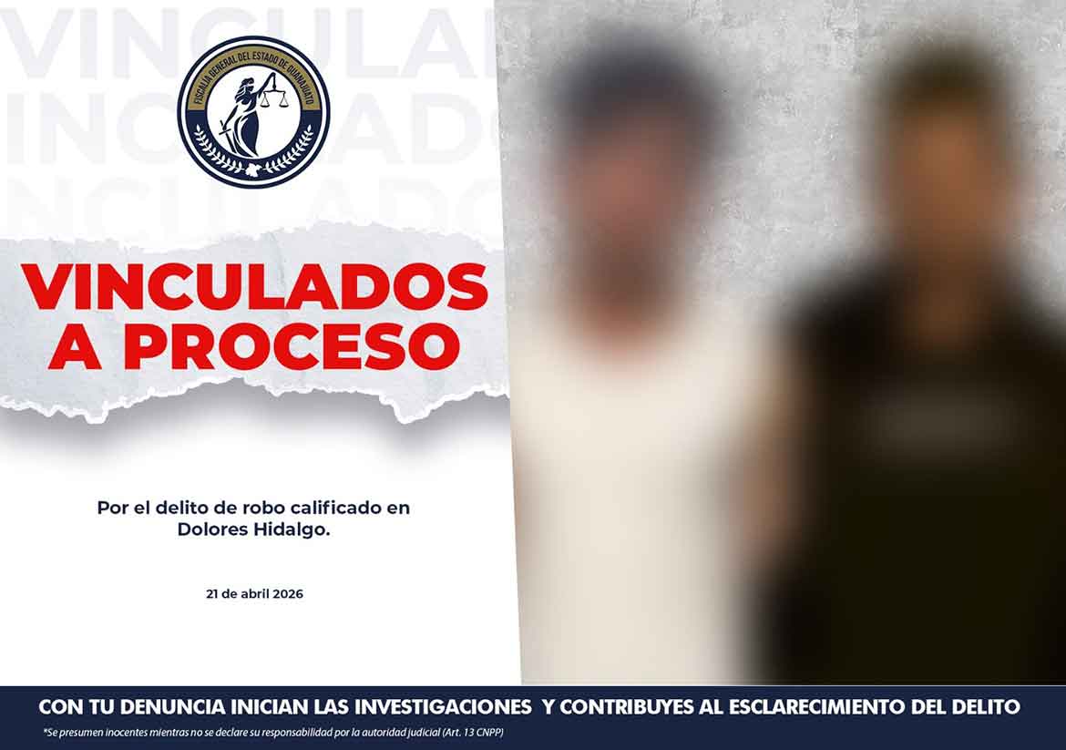 Tras labores de investigación y trabajo coordinado en campo, la Fiscalía General del Estado de Guanajuato dio a conocer que se obtuvo la vinculación a proceso de JUAN ANTONIO “N” y GUSTAVO “N”, quienes son investigados por su probable participación en un robo a casa habitación ocurrido en el municipio de Dolores Hidalgo.