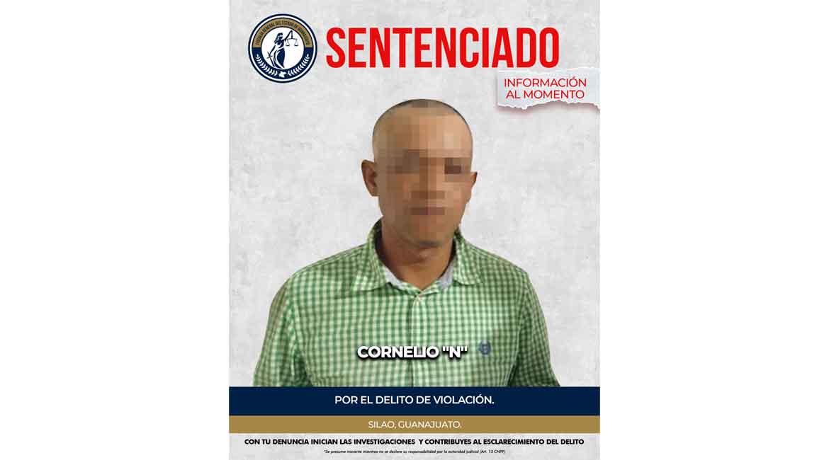 La Fiscalía General del Estado de Guanajuato obtuvo una sentencia condenatoria de 13 años y 4 meses de prisión, a través de un procedimiento abreviado, en contra de CORNELIO “N” por su responsabilidad en el delito de violación. Los hechos se registraron el 25 de diciembre de 2023, en una comunidad de la zona rural del municipio de Silao.
