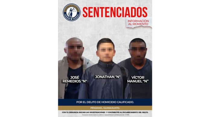 La Fiscalía General del Estado de Guanajuato logró que un órgano jurisdiccional dictara sentencia condenatoria de 27 años y seis meses de prisión en contra de JOSÉ REMEDIOS “N”, alias “el danonino”, VÍCTOR MANUEL “N” alias “el bebé” y JONATHAN “N”, alias “el chiquis”, al haber acreditado plenamente su responsabilidad penal en el delito de homicidio calificado.