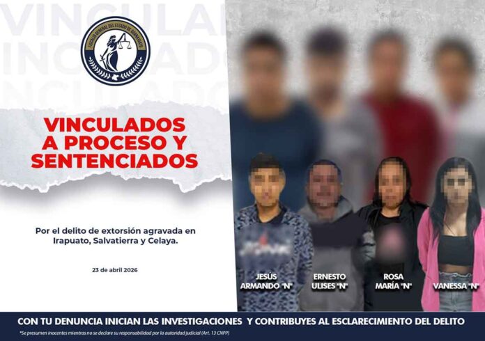 Los hoy sentenciados, identificados como JESÚS ARMANDO “N”, ERNESTO ULISES “N”, ROSA MARÍA “N” y VANESSA “N”, operaban mediante un esquema de extorsión que afectaba directamente a comerciantes y residentes de un fraccionamiento en las ciudades de Celaya e Irapuato.