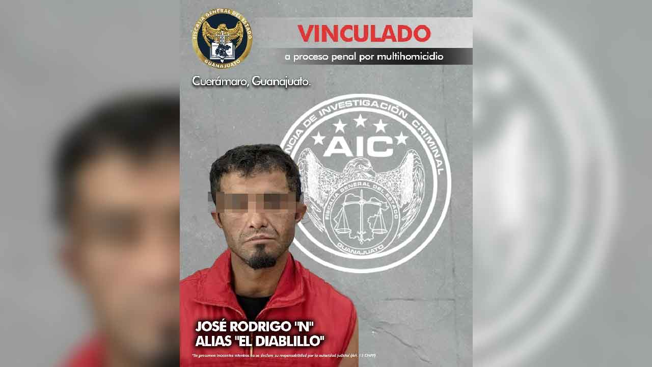 Cuerámaro, Gto. 10 de octubre de 2024.- JOSÉ RODRIGO “N” alias “El Diablillo” fue capturado por Agentes de Investigación Criminal de la Fiscalía de Guanajuato, quien obtuvo su vinculación a proceso penal por el homicidio de cuatro hombres en el municipio de Cuerámaro.