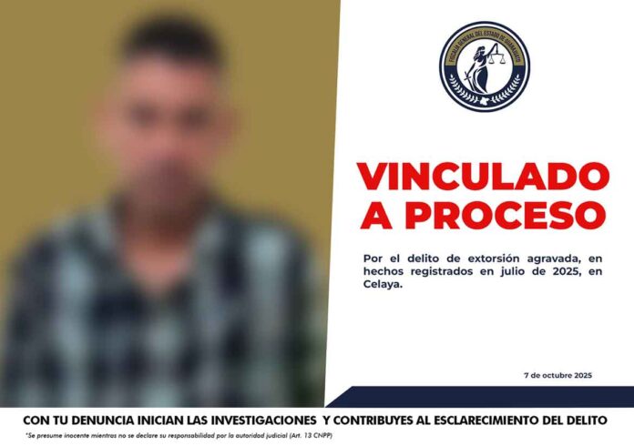 La Fiscalía General del Estado de Guanajuato, a través de la Unidad Especializada en Combate a la Extorsión, ha logrado que un juez de control vincule a proceso a EDUARDO DOLORES “N”, por su probable responsabilidad en el delito de extorsión agravada, cometido en contra de una víctima en el mercado de abastos Benito Juárez, en la ciudad de Celaya. Los hechos ocurrieron en el mes de julio de 2025, cuando la víctima fue abordada por un hombre que le exigía fuertes cantidades de dinero a cambio de no hacerle daño a él ni a su familia.