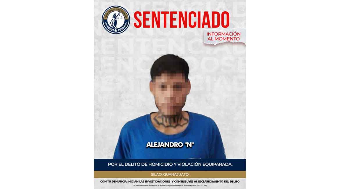 La Fiscalía General del Estado de Guanajuato obtuvo una sentencia condenatoria de 24 años y ocho meses de prisión en contra de ALEJANDRO “N” , por su plena responsabilidad en los delitos de homicidio y violación equiparada, cometidos en el municipio de Silao.