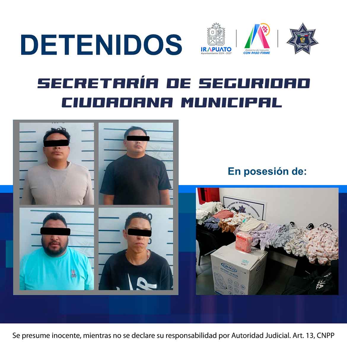 Irapuato, Gto., a 12 de septiembre de 2025.- Como resultado de la pronta atención que se brinda a la ciudadanía en los reportes que se reciben en el Sistema de Emergencias 9-1-1, la Policía Municipal de Irapuato detuvo a cuatro individuos señalados de intentar sustraer diversa mercancía de un supermercado, ubicado en el bulevar Prolongación Guerrero con bulevar Solidaridad, a la altura de la colonia Ejido.