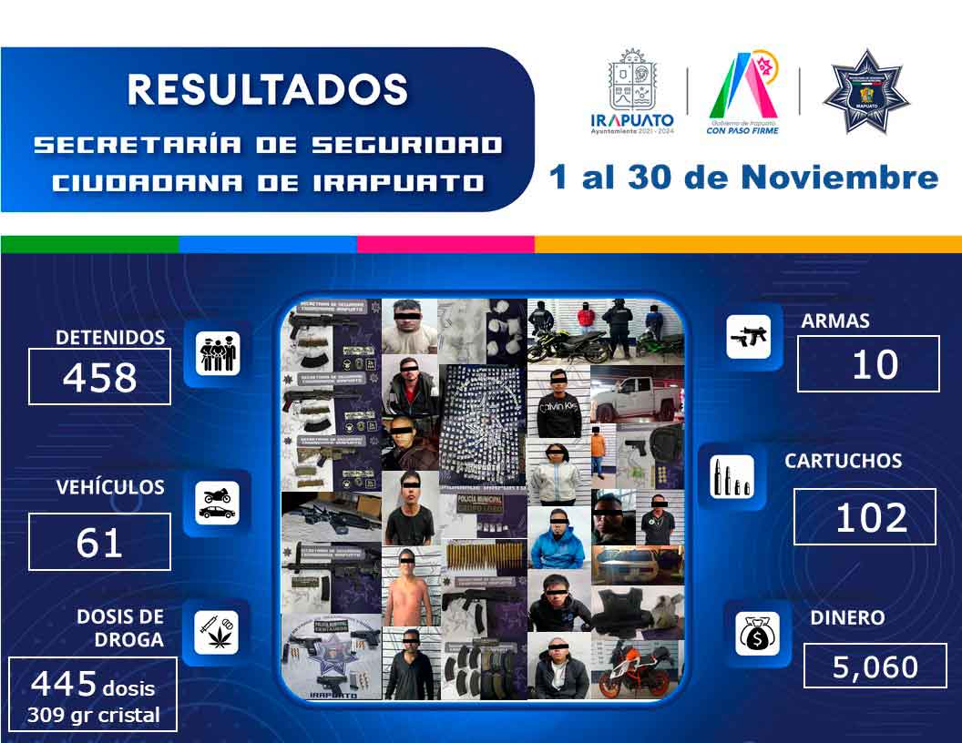 Estas cifras son el resultado de los dispositivos de prevención y seguridad implementados en la zona urbana y rural por personal de la corporación, en coordinación con autoridades de los tres niveles de gobierno que tienen como principal el objetivo de construir un Irapuato de paz y prosperidad para la ciudadanía y visitantes al municipio.