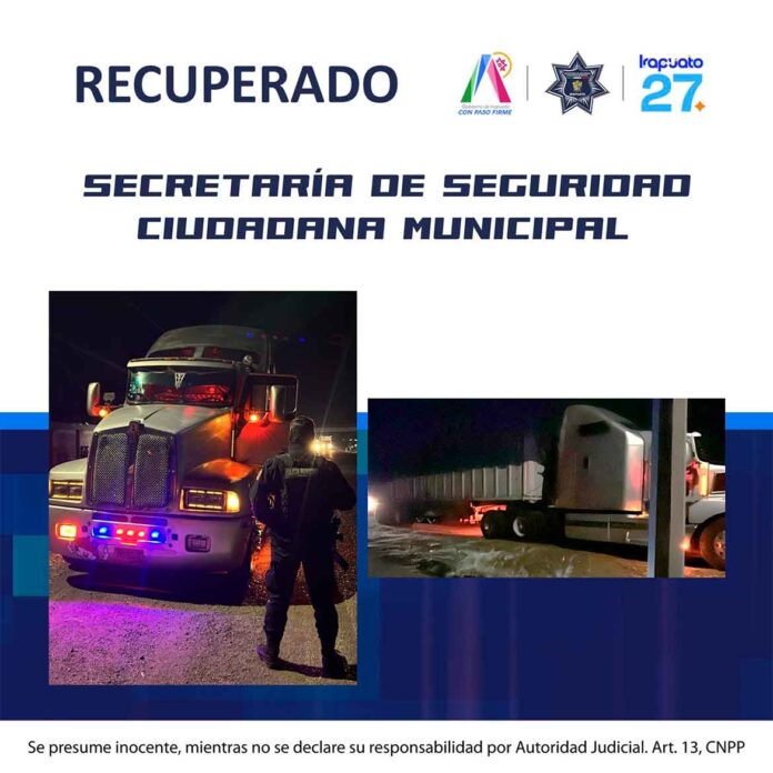 Irapuato, Gto., a 4 de febrero de 2026.- Derivado de un reporte oportuno al sistema de emergencias 9-1-1, elementos de la Policía Municipal de Irapuato localizaron y recuperaron en la carretera Abasolo–Irapuato, a la altura de la comunidad Valenciana de Yostiro, un tractocamión robado con violencia la madrugada del 3 de febrero en el municipio de Abasolo.